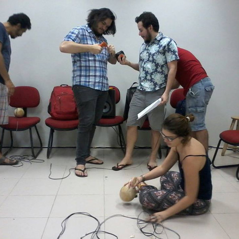 Pois bem, na semana seguinte, quarta, foi à vez de experimentarmos a ideia que tivemos. Além da ideia do meu trabalho experimentado, trabalhamos também com a ideia de Felipe Damasceno e do David. O espaço estava aberto para irmos trazendo ideias para experimentar em sala. Depois de trabalharmos ao longo do curso com espacialização sonora, imagens, sensores, programas e interfaces, íamos acumulando proposições que começava da dar um grande caldo ao curso, aos trabalhos.